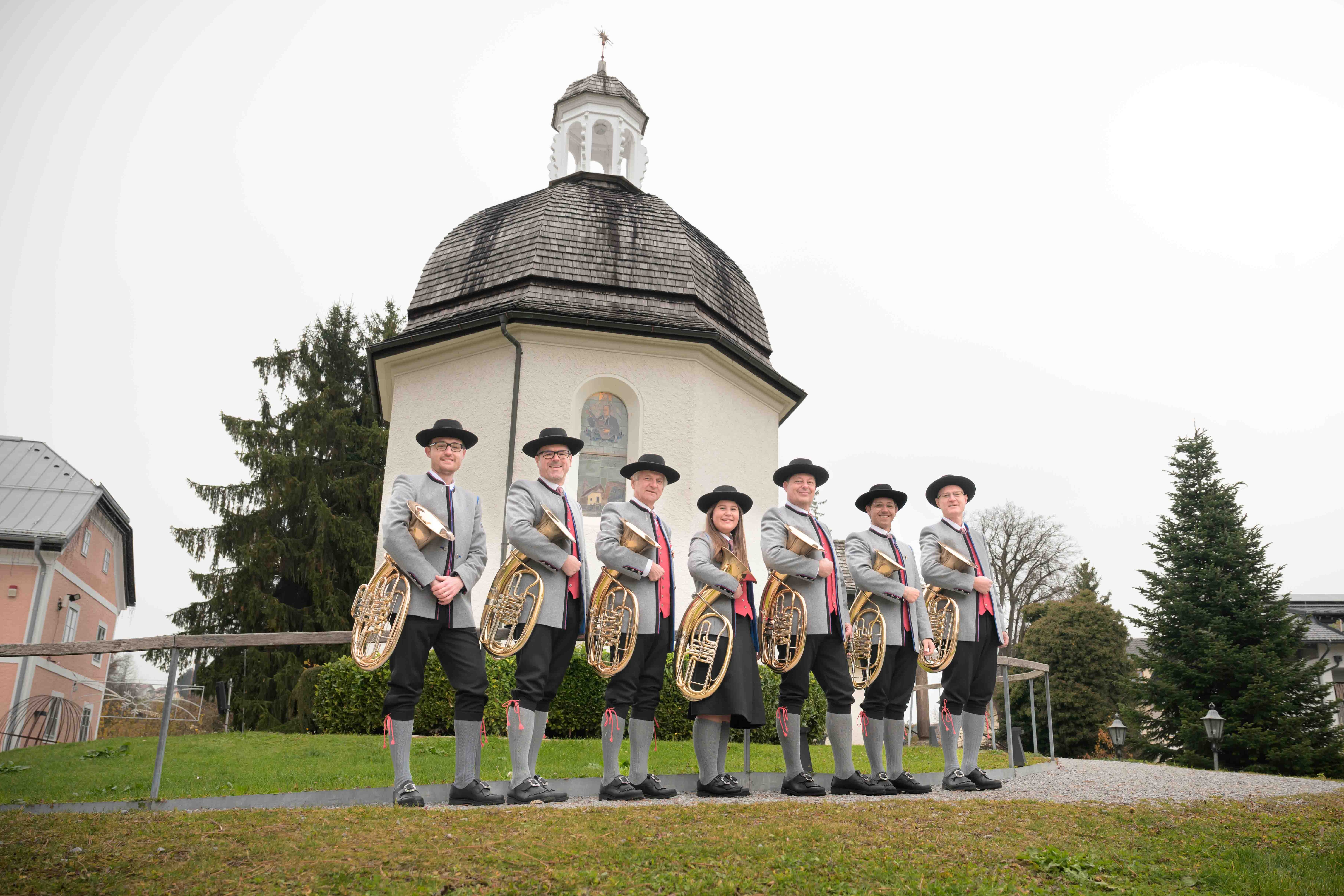 im Bild v.l.r.: Bastian Gugerbauer, Gerhard Bauerstatter, Peter Hufnagl, Magdalena Edelmann, Robert Edelmann, Simon Ratkowitsch, Martin Gugerbauer (Kapellmeister)nicht im Bild: Günther Gugerbauer